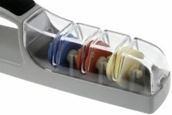 Le Work Sharp Kitchen Edge Sharpener est un aiguiseur de type « pull through » simple d’utilisation et abordable. Grâce aux inserts en carbure convexes à l’étape 1 et à une petite meule en céramique fine à l’étape 2, vous aiguiserez vos couteaux rapidement et efficacement. Cet aiguiseur à couteaux a un angle de 20°. Grâce à cette construction, vous conservez toujours le même angle d’aiguisage. Cet aiguiseur étant petit, il est facile à ranger dans un tiroir de cuisine ou à emporter en voyage.